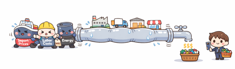 Think of inflation like pressure building in a pipe. It starts upstream with raw materials, imports, and wages, then slowly works its way down to consumers.